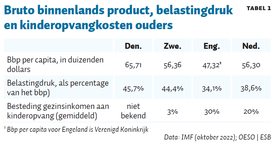 In het algemeen is de belastingdruk in landen met weinig collectieve voorzieningen laag, en is deze andersom hoog in landen met ruime voorzieningen. Dat blijkt uit een vergelijking tussen de financiering van de voorzieningen tussen de landen aan de hand van het bbp per hoofd van de bevolking, de belastingdruk (de mate waarin de heffingen drukken op het besteedbaar inkomen) en de besteding van dat inkomen aan de kosten (dus wat ouders in totaal zelf moeten betalen) van kinderopvang (tabel 1). De lagere kosten voor ouders in Zweden en Denemarken gaan dus samen met hogere publieke lasten.