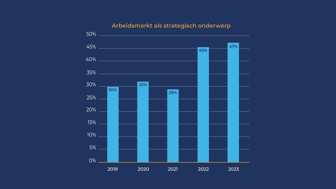 Na een sterke toename in 2022 geeft 47% van de deelnemers ook dit jaar aan dat de arbeidsmarkt nog steeds een grote strategische impact heeft op de koers van de eigen organisatie. Dat blijkt uit het onlangs uitgevoerde Strategie Trendsonderzoek.