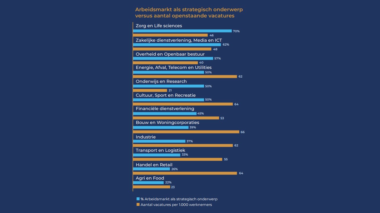 Er is wel een behoorlijke spreiding in de mate waarin de arbeidsmarkt strategische impact heeft. Zo meldt 70% van de deelnemers in de Zorg en Life sciences en 62% van de deelnemers in de Zakelijke dienstverlening dat die impact groot is. In de Handel en retail is dit daarentegen 26% en in Agri en Food 22%.